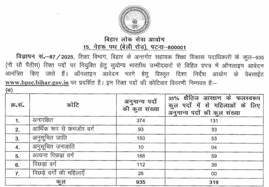पदों की संख्या : Bihar Block Level AEDO Vacancy 2025