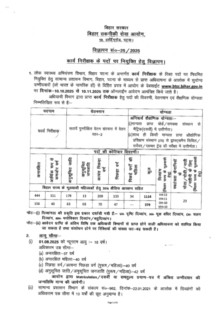 अगर जो भी उमीदवार है, तो यह उनके लिए बहुत बढ़िया खुसखबरी है जो सरकारी नौकरी तैयारी कर रहे थे और सरकारी नौकरी की तलाश कर रहे थे | यह बिहार तकनीकी सेवा आयोग (BTSC) ने Work Inspector के लिए आधिकारिक नोटिफिकेशन को 1114 पदों पर भर्ती जारी की है | अर्थात इस भर्ती का ऑनलाइन आवेदन करने की तिथि 10 October 2025 से लेकर 10 November 2025 तक किया जायेगा | और आप पूरी प्रिक्रिया को जानने के लिए आधिकारिक वेबसाइट पर चेक कर सकते है |