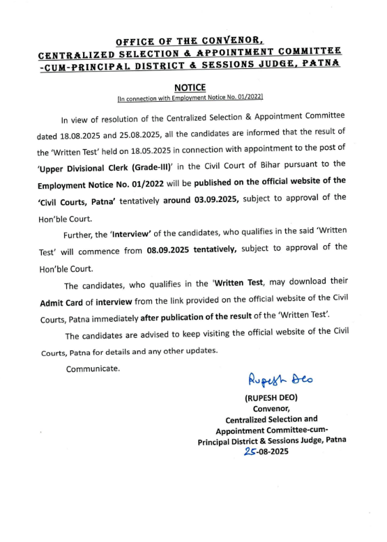 महत्वपूर्ण तिथियाँ : Bihar Civil Court Clerk Mains Result 2025