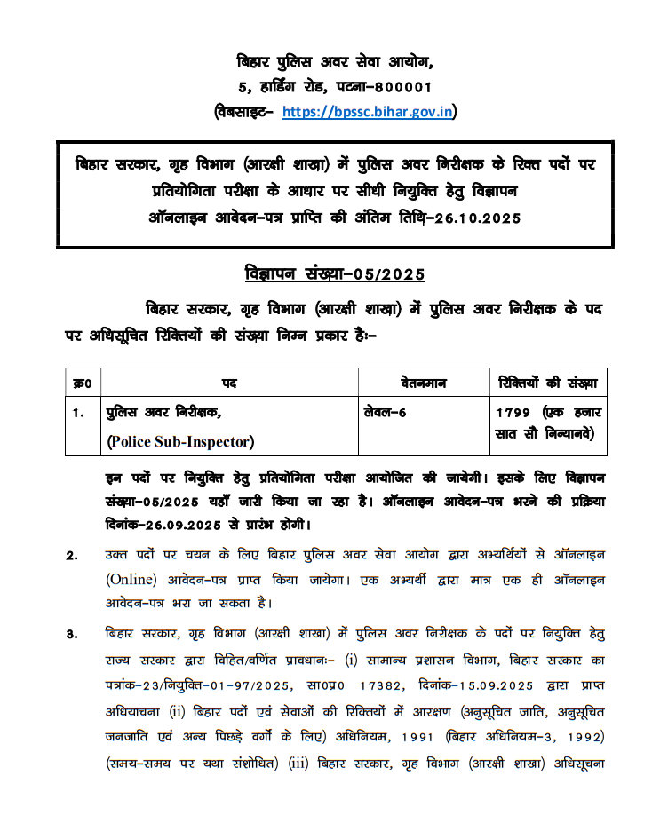 अगर जो उमीदवार बिहार दरोगा Sub Inspector के लिए तैयारी कर रहे थे उनके लिए बहुत बढ़िया खुसखबरी आया है | अर्थात यह बिहार पुलिस ने Sub Inspector (SI) दरोगा के पदों के लिए नोटिफिकेशन जारी किया है। अतः जिसमे कुल 1799 पदों भर्ती का नियुक्ति किये जायेंगे | अर्थात इस आवेदन को ऑनलाइन करने का तिथि 26/09/2025 शुरू कर दिया गया है जो भी अभियार्थी इस आवेदन को भरना चाहेंगे वे अपना दस्तावेज को एकत्रित कर ले और ऑनलाइन अपने समय से कर ले | अर्थात अधिक जानकारी के लिए आप अपने आधिकारिक वेबसाइट पर जा सकते है |