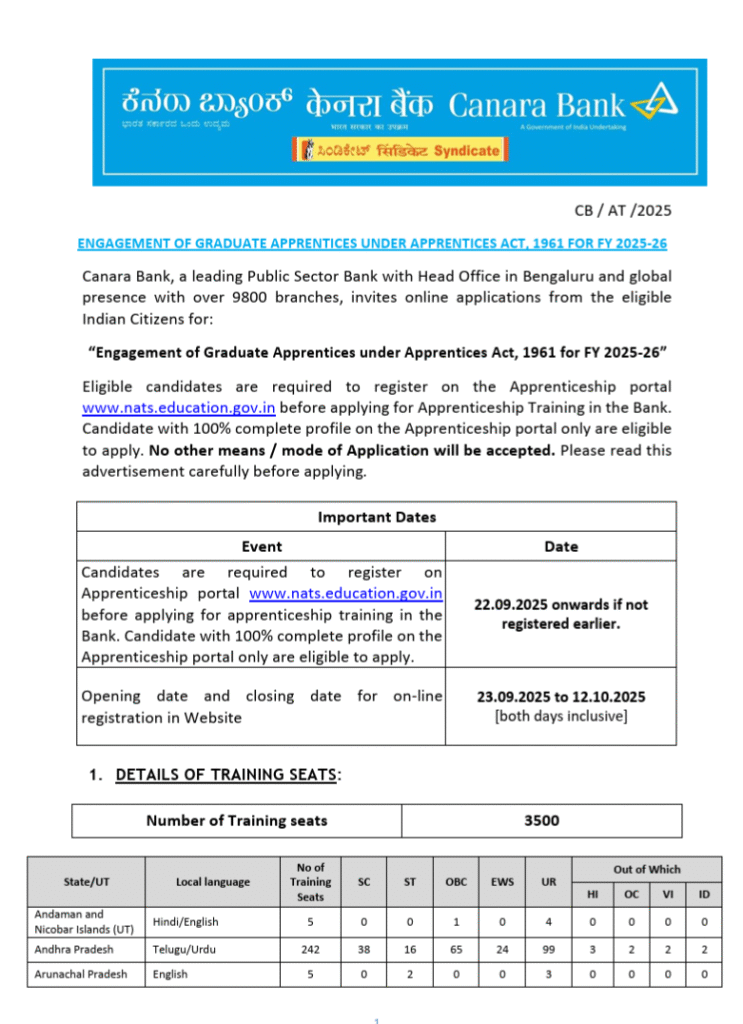 अगर जो भी उमीदवार बैंकिंग सेक्टर में करियर बनाने का सपना देख रहे हैं, तो यह आपके लिए एक बहुत ही बढ़िया अवसर है | अर्थात यह कैनरा बैंक (Canara Bank) के द्वारा हर के भाती इन साल 2025 में भी Apprentice Recruitment का ऑफिशियल नोटिफिकेशन को जारी कर दिया गया है। अतः इसमें उम्मीदवारों को कुल 3500 पदों पर भर्ती की नियुक्ति की जाएगी। अर्थात इस भर्ती का ऑनलाइन आवेदन करने की तिथि 23 September 2025 से लेकर 12 October 2025 तक होगी |