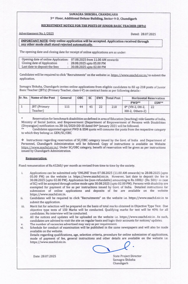 यह चंडीगढ़ शिक्षा विभाग के द्वारा JBT Teacher Recruitment 2025 के तहत भर्ती का नोटिफिकेशन को जारी किया गया था अर्थात इसमें कुल 218 पदों पर भर्ती निकाली गई थी है। वे उम्मीदवार जो इस भर्ती के लिए ऑनलाइन आवेदन किया था, उनका एडमिट कार्ड और हॉल टिकट को जारी कर दिया गया है वे अपना एडमिट कार्ड को आधिकारिक वेबसाइट के माध्यम से डाउनलोड कर सकते है