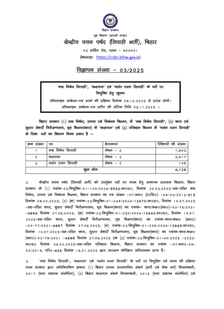 अगर जो उमीदवार बिहार में सरकारी नौकरी का तैयारी कर रहे है उन अभियार्थीयो के लिए एक बहुत ही सुनहरा अवसर आया है। जो बिहार सरकार ने सेंट्रल सिलेक्शन बोर्ड ऑफ कॉन्स्टेबल (CSBC), बिहार ने विज्ञापन संख्या 03/2025 के अंतर्गत बड़ी भर्ती का नोटिफिकेशन जारी कर दिया है। अर्थात इसमें कुल 4128 पदों पर भर्ती किये जायेंगे | अतः जो भी अभियार्थी इस सरकारी नौकरी देख रहे है और तैयारी कर रहे है वे उमीदवार इस आवेदन को अप्लाई कर सकते है|