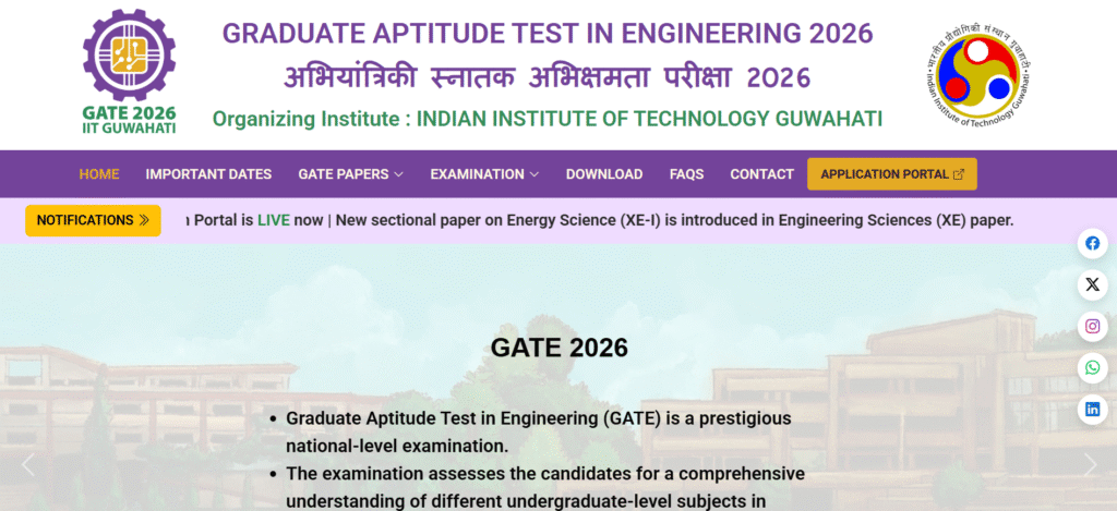 यह भारत में इंजीनियरिंग और टेक्निकल के क्षेत्र में उच्च शिक्षा और PSU है | अर्थात नौकरी का सपना देखने वाले लाखों छात्रों के लिए GATE Exam सबसे महत्वपूर्ण परीक्षाओं में से एक मणि जाती है। अतः IIT Guwahati ने GATE 2026 का Notification को जारी कर दिया है और GATE 2026 के लिए ऑनलाइन रजिस्ट्रेशन की प्रक्रिया भी शुरू हो चुकी है। अर्थात जो अभियार्थी GATE 2026 में शामिल होना चाहते हैं अतः आप इसे समय रहते इस GATE 2026 के आवेदन कर दे, और मै इस लेखन के माधयम से GATE 2026 के तहत सभी जानकारियों को बहुत ही अच्छे तरिके से बताऊंगा जैसे की महत्वपूर्ण तिथियां, आवेदन प्रक्रिया, एग्जाम डेट, शैक्षणिक योग्यता, आवेदन शुल्क, आदि |