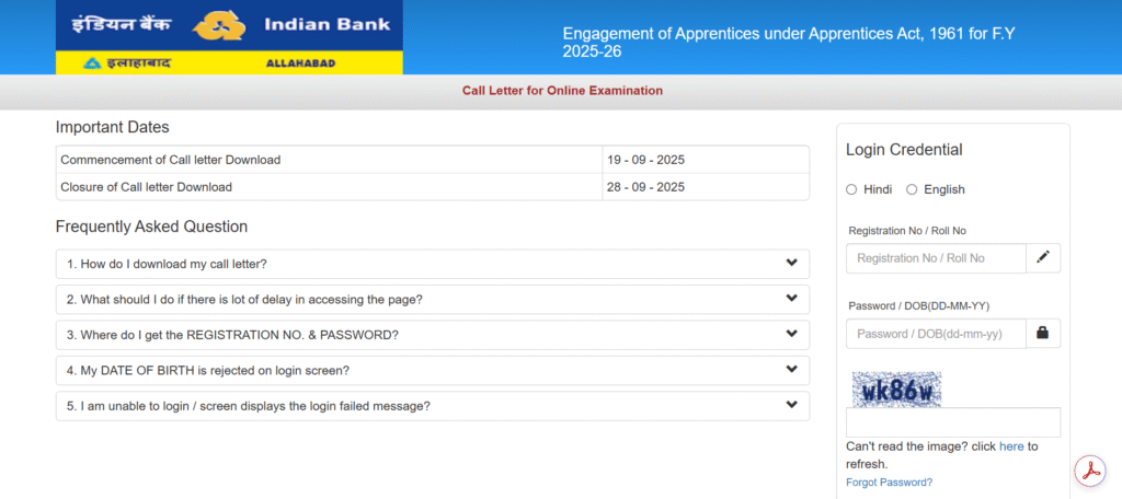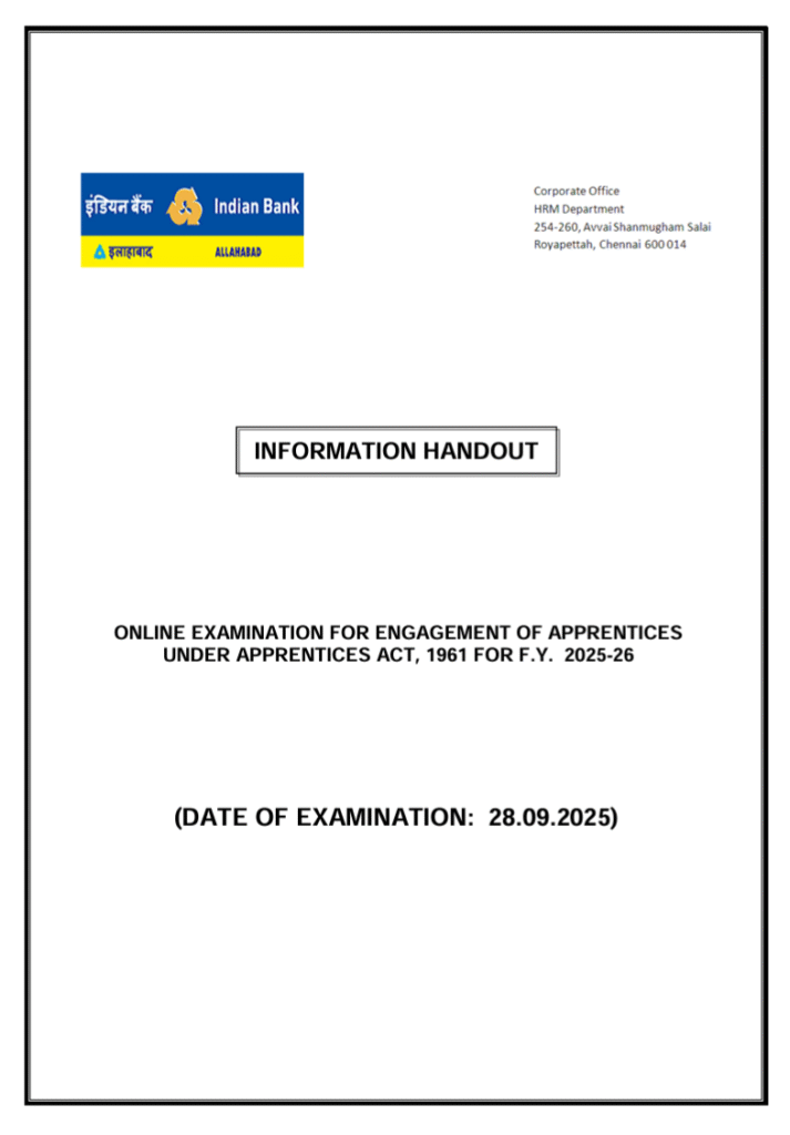 अगर जो उमीदवार Apprentice पद के लिए ऑनलाइन आवेदन किया था , उन अभियर्थियों का एडमिट कार्ड Indian Bank के तहत आधिकारिक वेबसाइट पर जारी कर चूका है | अर्थात इसमें कुल 1500 पदों के लिए परीक्षा की घोषणा किया गया है | अतः इस पद के लिए परीक्षा की तिथि 28/09/2025 को घोषित किया गया है |