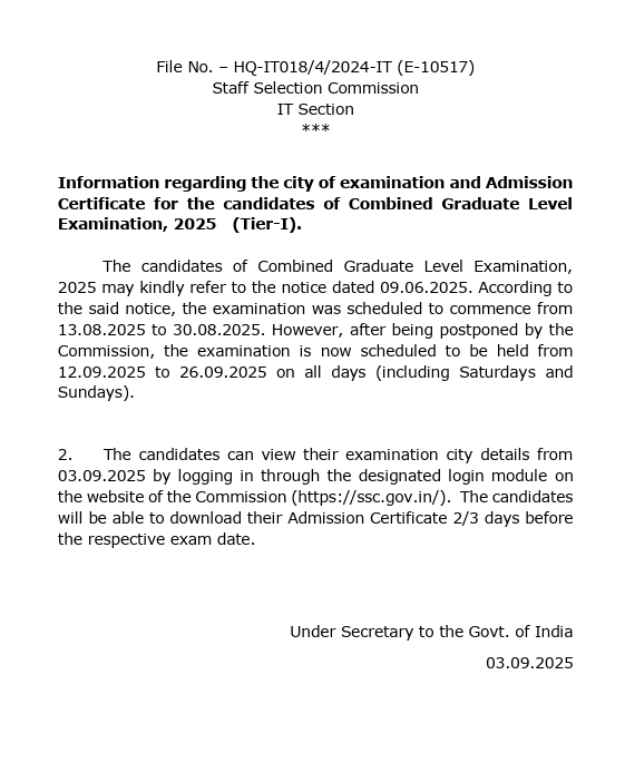 बहुत दिनों के इंतजार के बाद Staff Selection Commission के तहत Combined Graduate Level 2025 का Tier 1 Exam के लिए Exam City स्लिप जारी कर दिया है। अर्थात जो भी अभियार्थी इस एग्जाम के लिए फॉर्म भरे थे वे अपना अब Exam City स्लिप और अपने एग्जाम की तारीख और शिफ्ट देख सकते हैं। अर्थात आप अपने User ID के माध्यम से अपने आधिकारिक वेबसाइट पर जाकर अधिक जानकारी को प्राप्त कर सकते है |